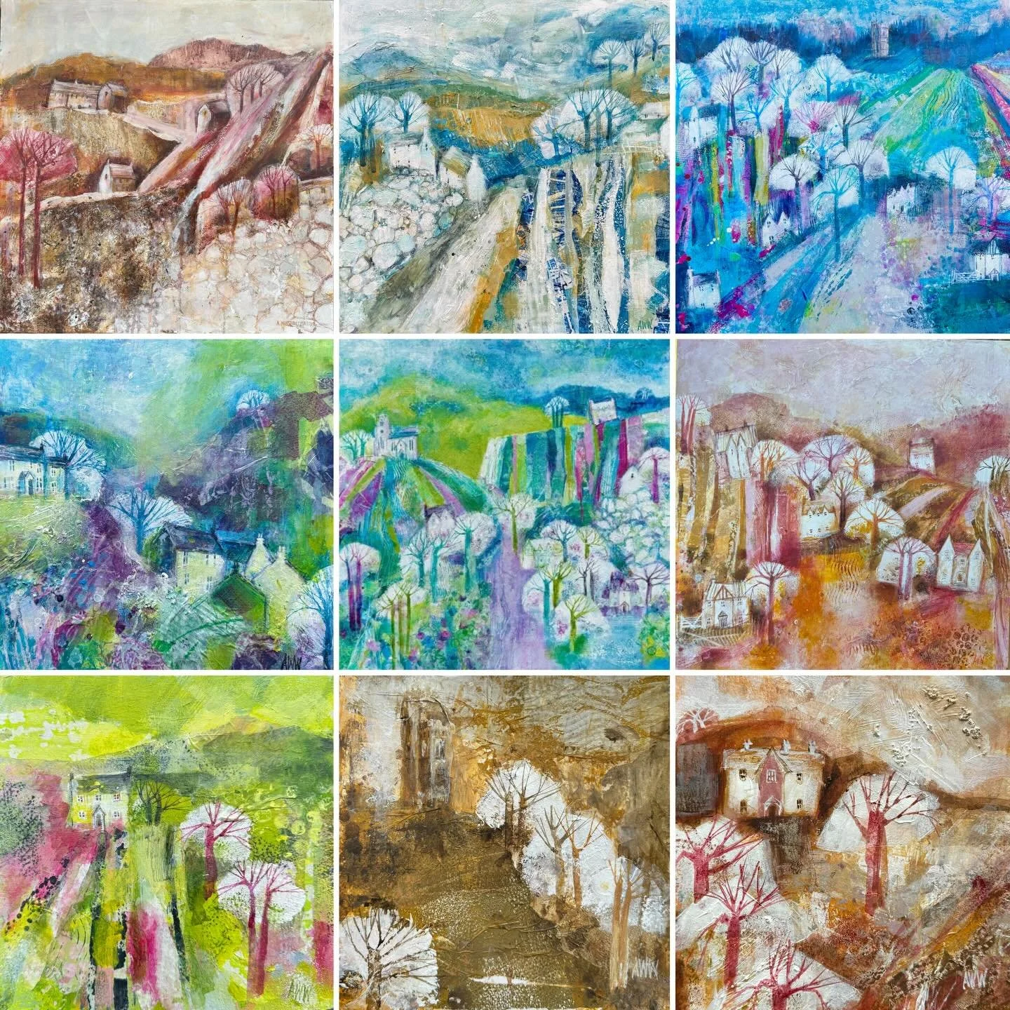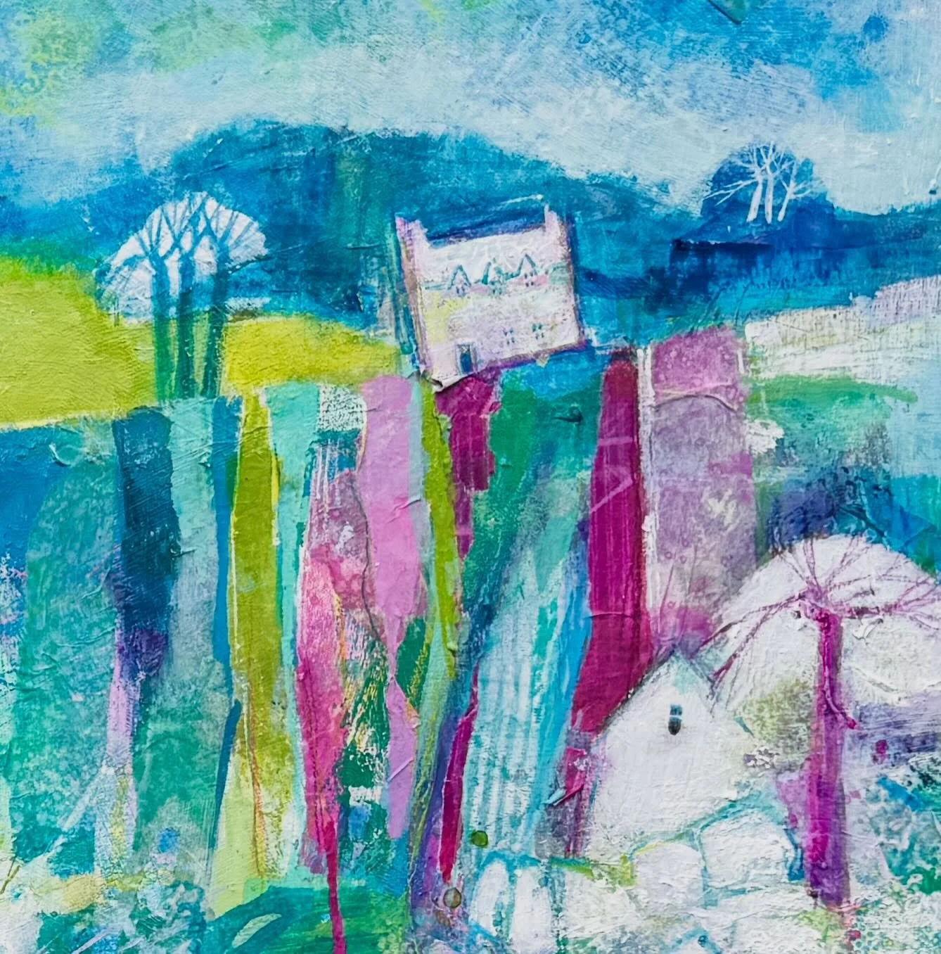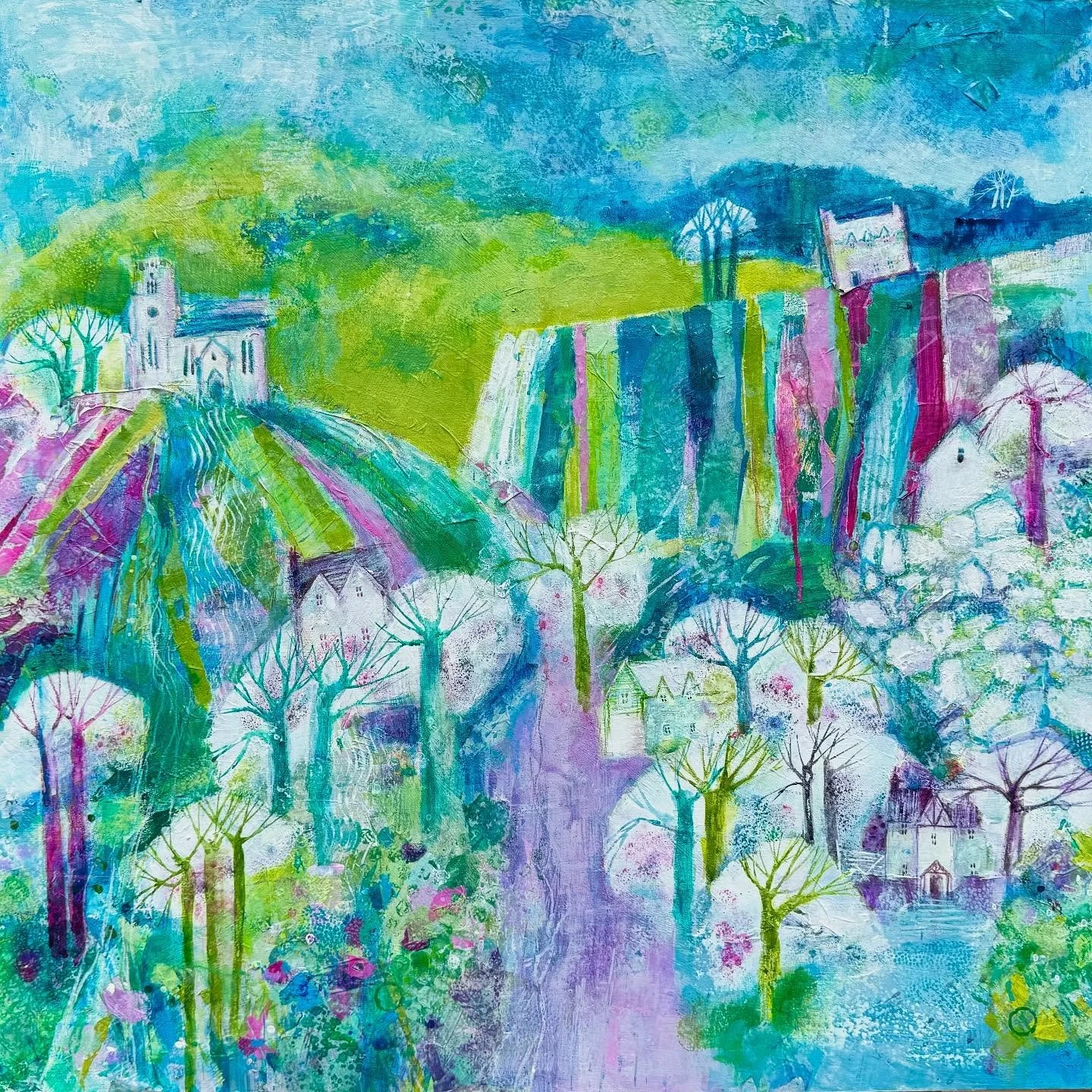 Joyful, semi-abstract landscapes full of gorgeous colours, rich textures and expressive mark making.