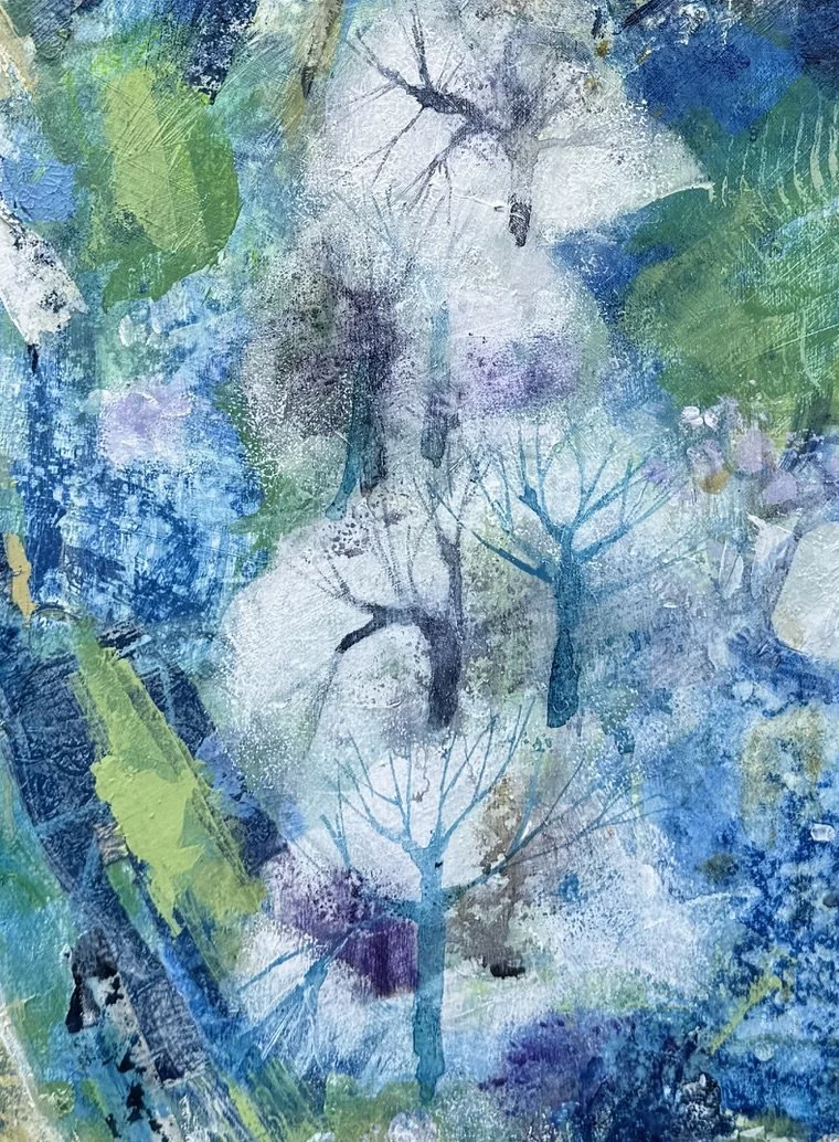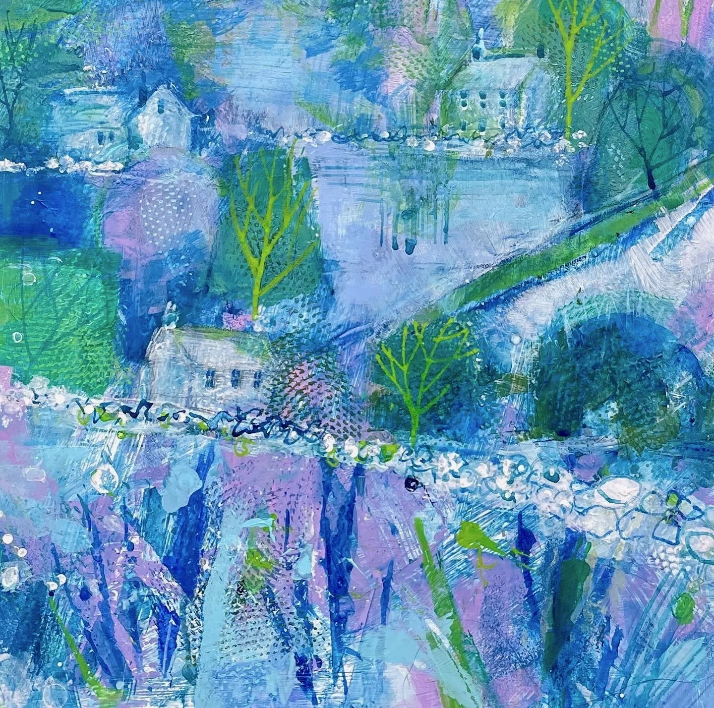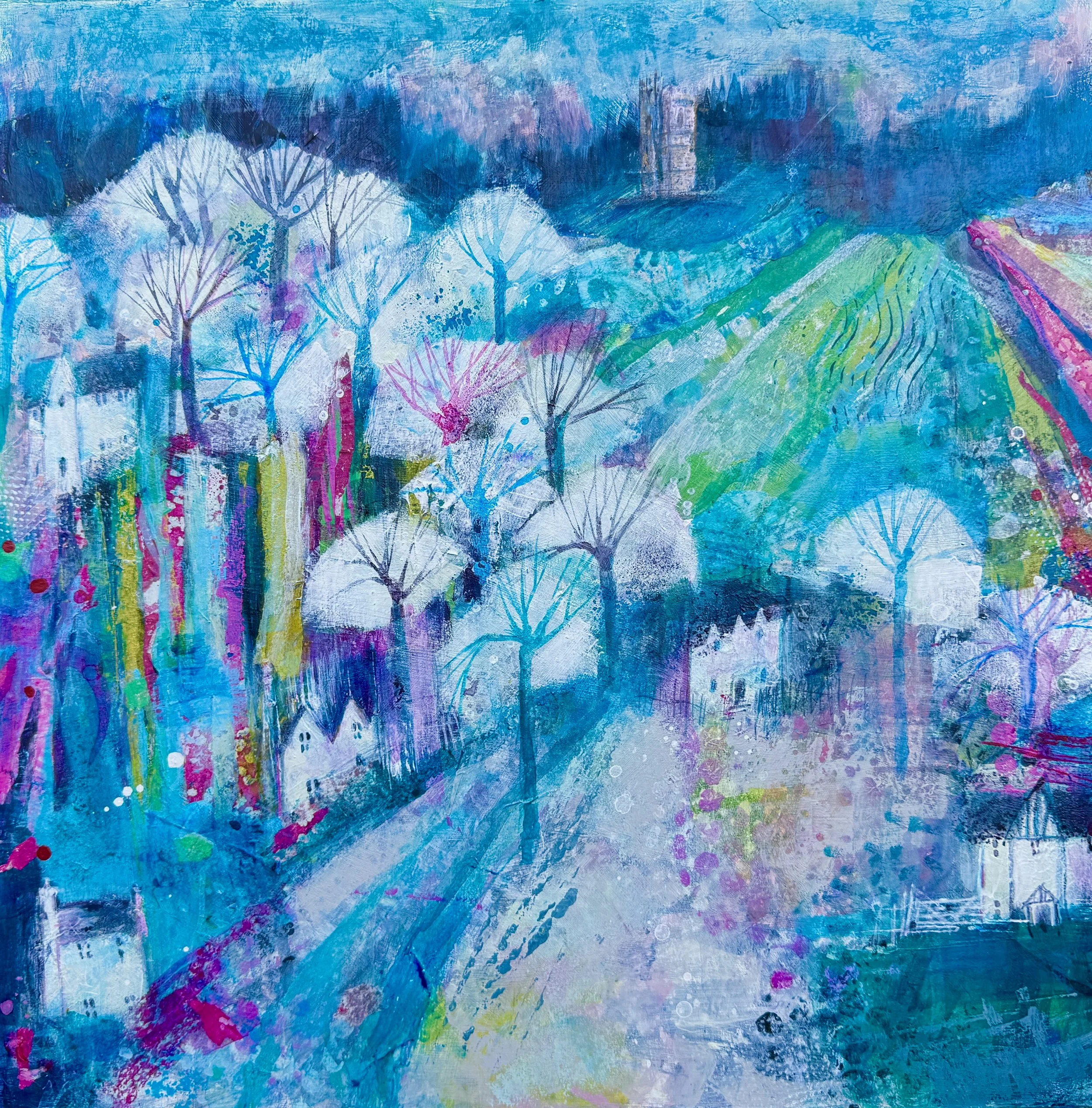 My joyful, lyrical and semi-abstract landscapes are inspired by the Surrey Hills, North Yorkshire and South Downs. Characterised by layers of gorgeous colours, expressive mark making and rich texture, my mixed media paintings explore nostalgia, identity and belonging, linking my northern roots with my present life in the south. My work blends playful imagination reminiscent of fairytales with a deeper reflection on our relationship with the natural world.