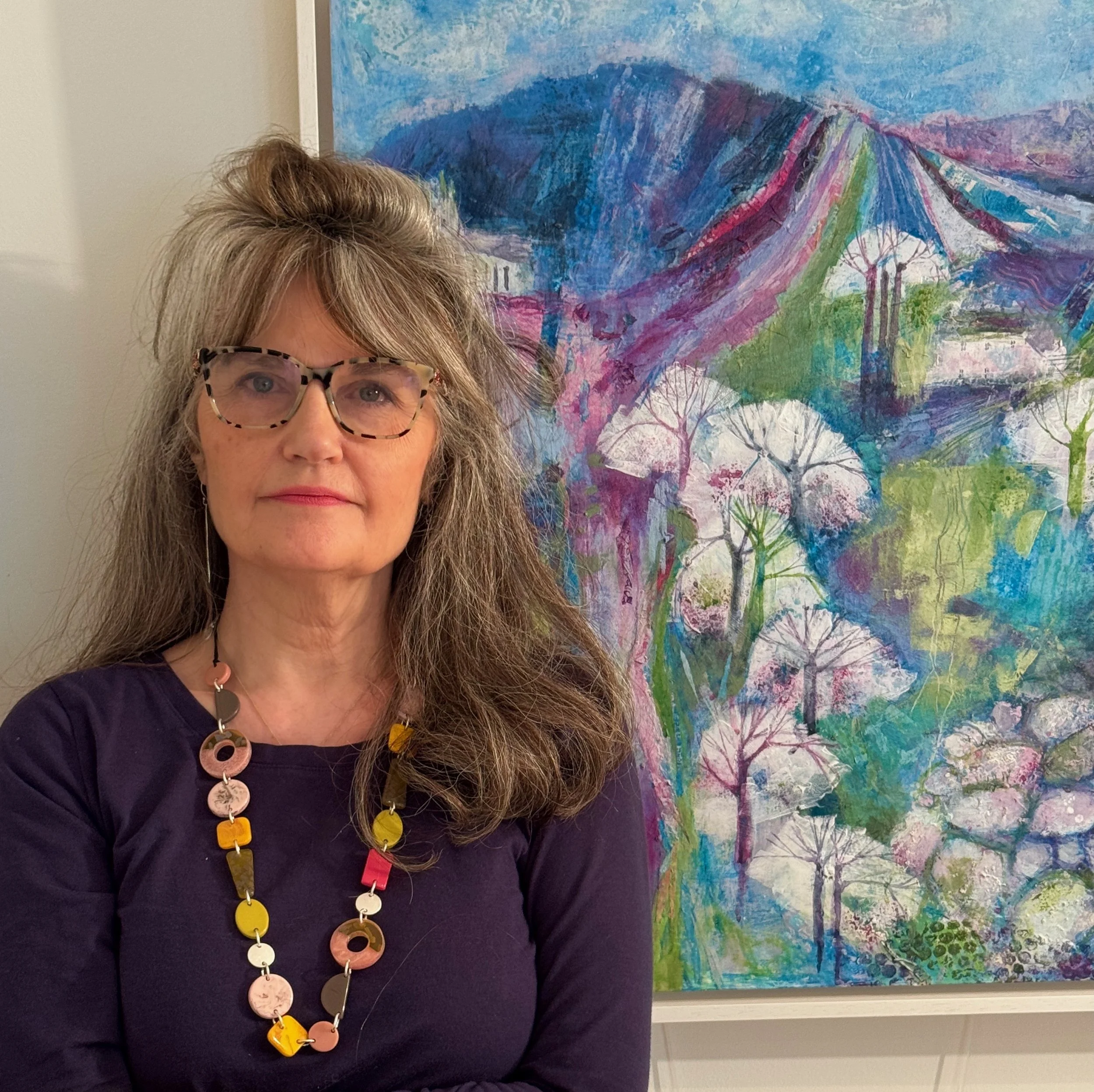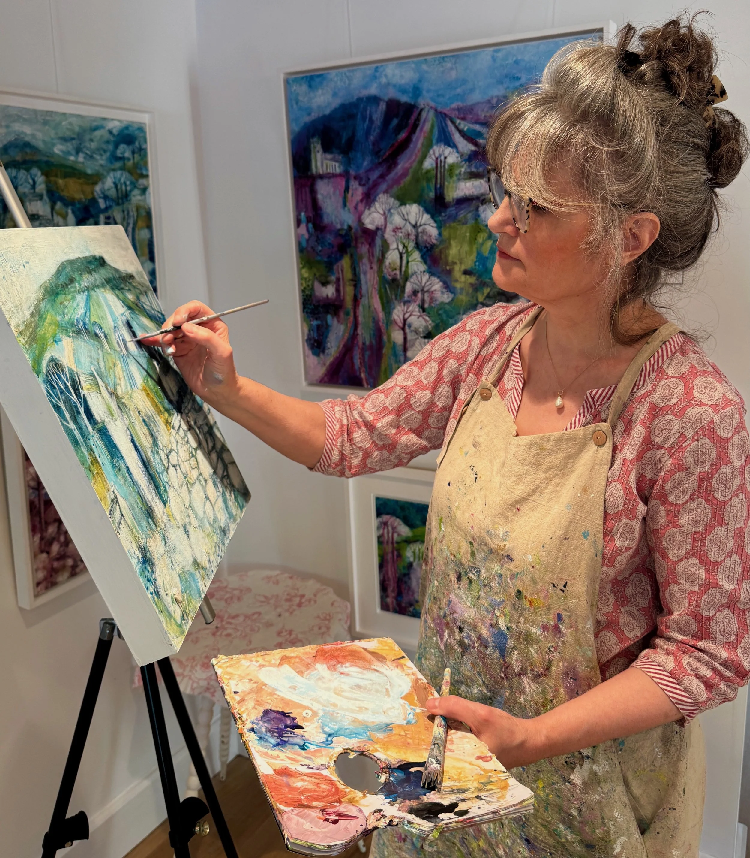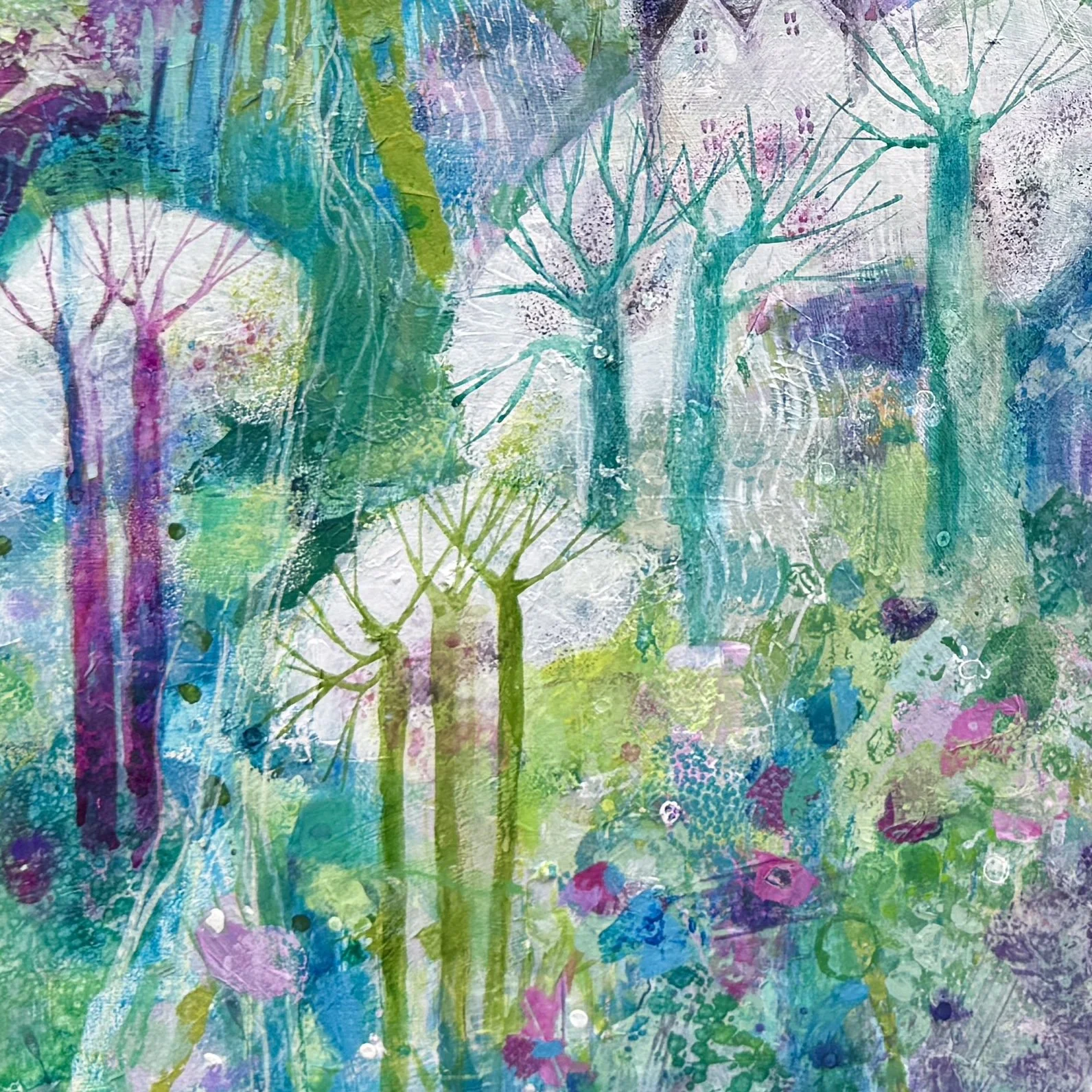 My joyful, lyrical and semi-abstract landscapes are inspired by the Surrey Hills, North Yorkshire and South Downs. Characterised by layers of gorgeous colours, expressive mark making and rich texture, my mixed media paintings explore nostalgia, identity and belonging, linking my northern roots with my present life in the south. My work blends playful imagination reminiscent of fairytales with a deeper reflection on our relationship with the natural world.