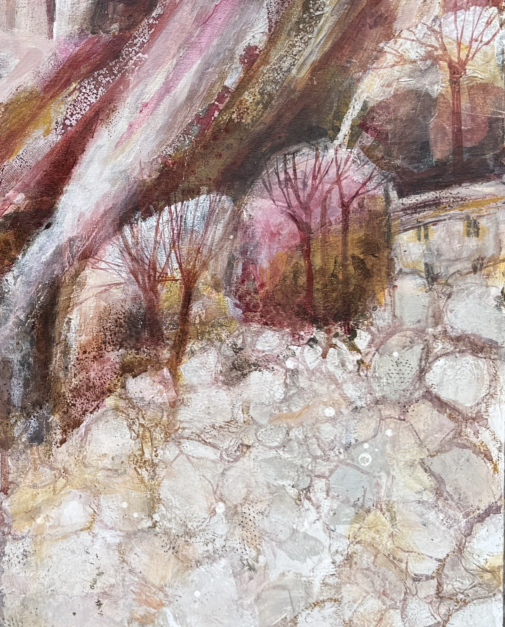 From initial sketches based on the landscape's lines, shapes and patterns, the final pieces are developed using a playful paint application of layered acrylics, glazes, pastels, oil sticks, inks and collage creating tactile surfaces that evoke weathered rocks, distant hills and uplifting, lyrical scenes full of movement and energy. Collaged elements of gelli prints, poetry and music manuscript enhance visual interest and narrative. Angular trees, little houses, and stone walls gradually emerge to form uplifting, lyrical landscapes that capture both memory and place.